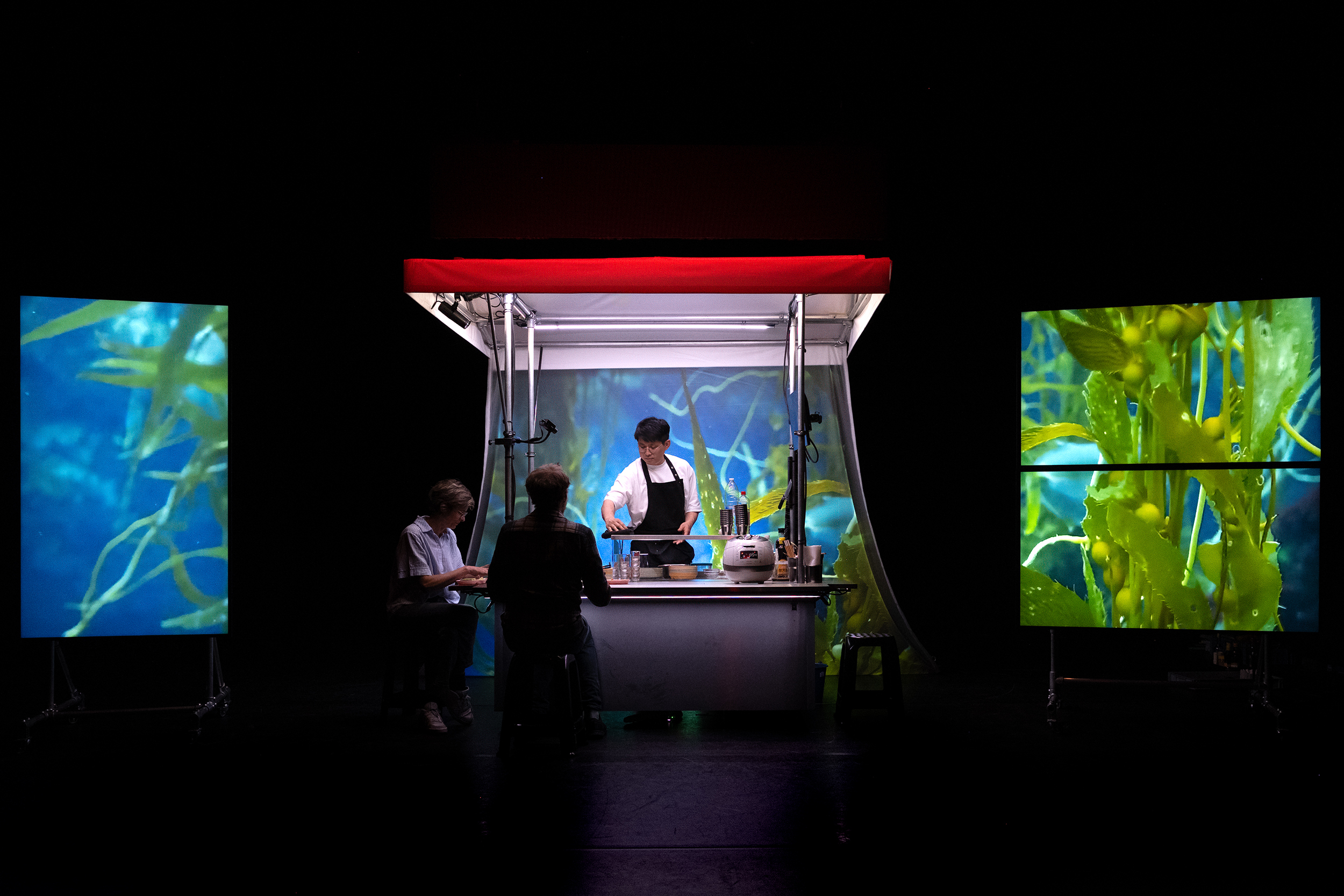 Η απρόσμενη γεύση της σούπας με φύκια, ο κοφτός ήχος του μαχαιριού καθώς κόβει το αγγούρι, και το τσιτσίρισμα των μανιταριών πάνω στην πυρακτωμένη εστία εμπλέκουν τους θεατές σε μια πολυαισθητηριακή εμπειρία με επίκεντρο τη γεύση και την παράδοση.